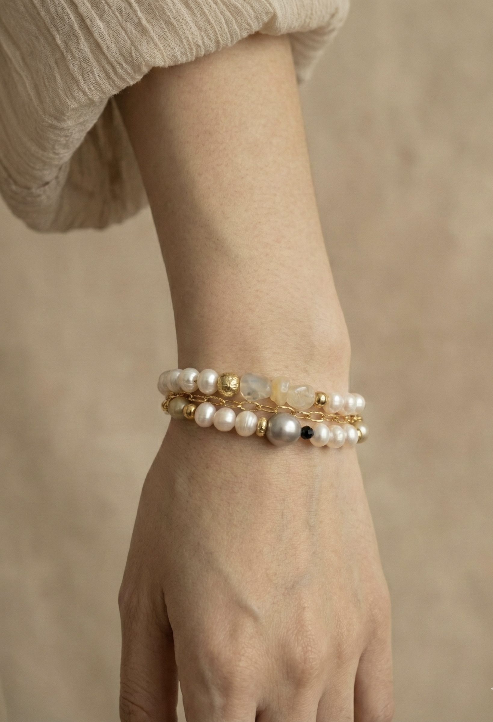 • 天然淡水珍珠與金色鍊條交錯,柔中帶剛